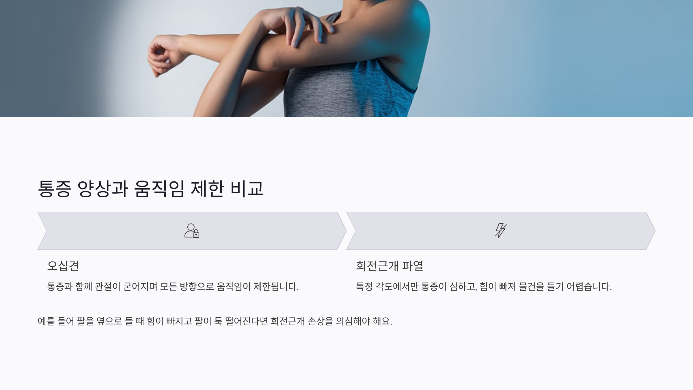 오십견은 통증과 함께 관절이 굳어지며 모든 방향으로 움직임이 제한됩니다. 회전근개 파열은 특정 각도에서만 통증이 심하고, 힘이 빠져 물건을 들기 어렵습니다. 예를 들어 팔을 옆으로 들 때 힘이 빠지고 팔이 툭 떨어진다면 회전근개 손상을 의심해야 해요.