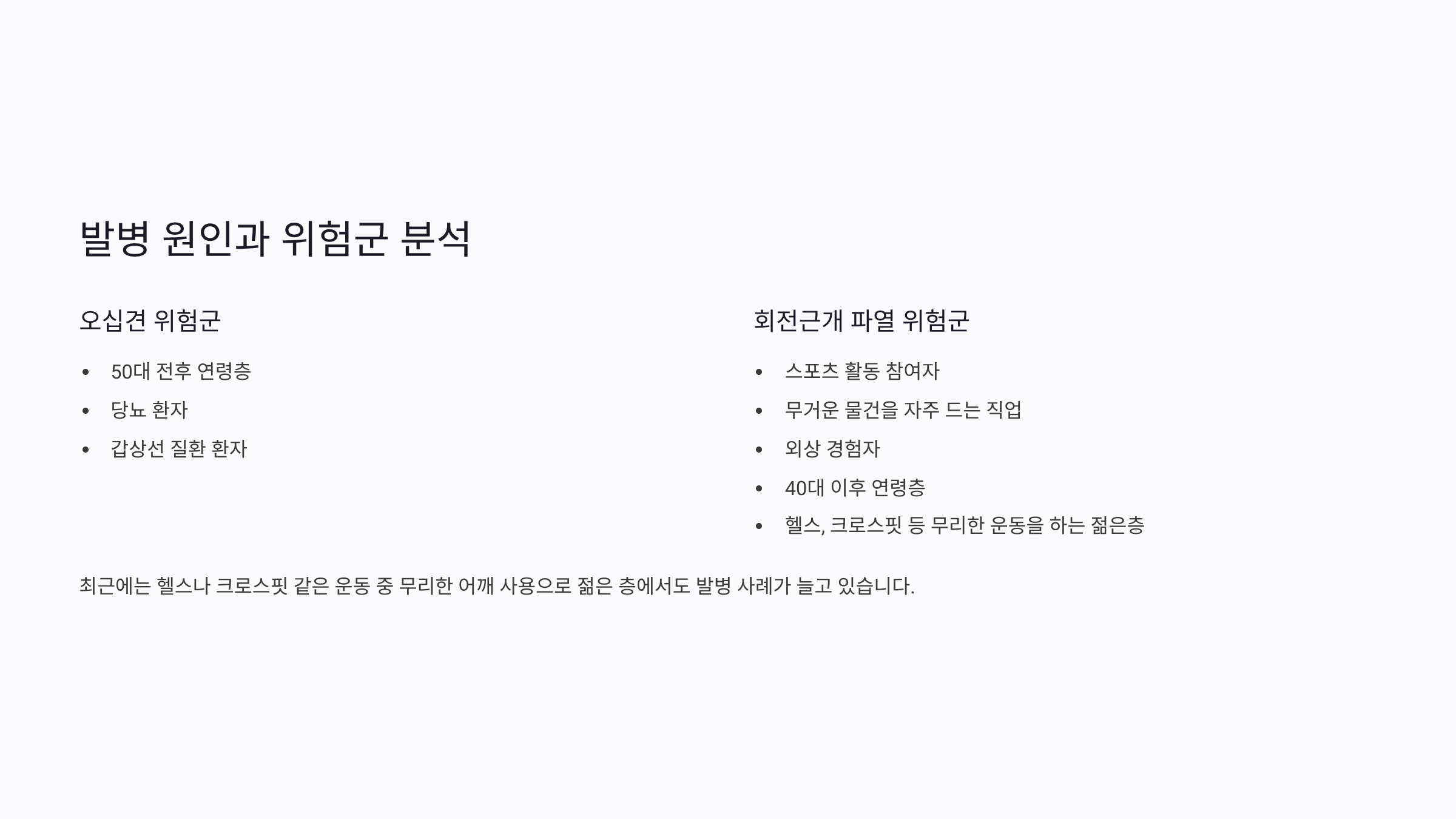 오십견은 50대 전후, 당뇨·갑상선 질환 환자에서 많이 나타납니다. 회전근개 파열은 스포츠, 무거운 물건 들기, 외상, 노화로 발생하며 40대 이후부터 증가합니다. 최근에는 헬스나 크로스핏 같은 운동 중 무리한 어깨 사용으로 젊은 층에서도 발병 사례가 늘고 있습니다.