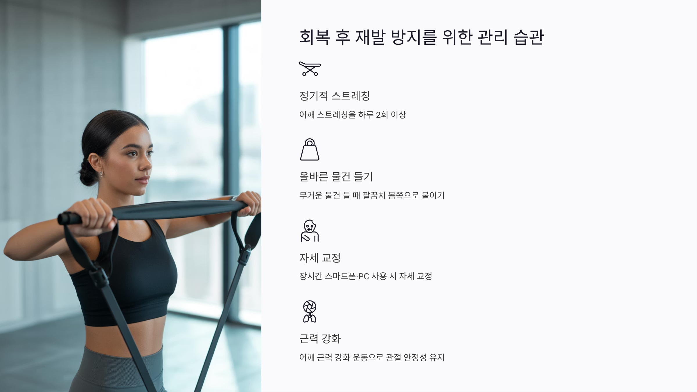 - 어깨 근력 강화 운동으로 관절 안정성 유지