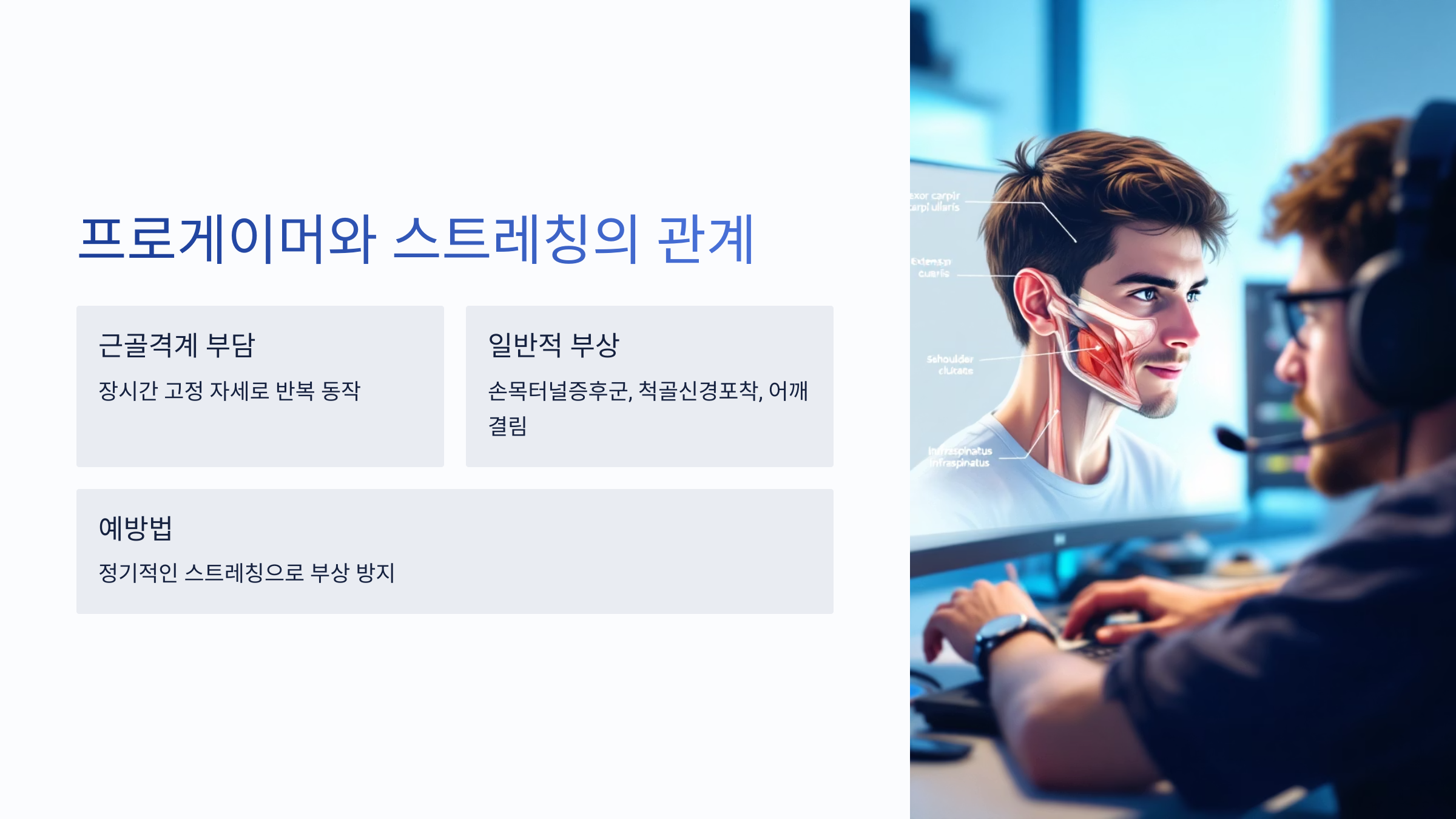 e스포츠 선수들은 장시간 고정된 자세로 손과 팔을 반복 사용하며, 일반 운동선수 못지않은 근골격계 부담을 받습니다.