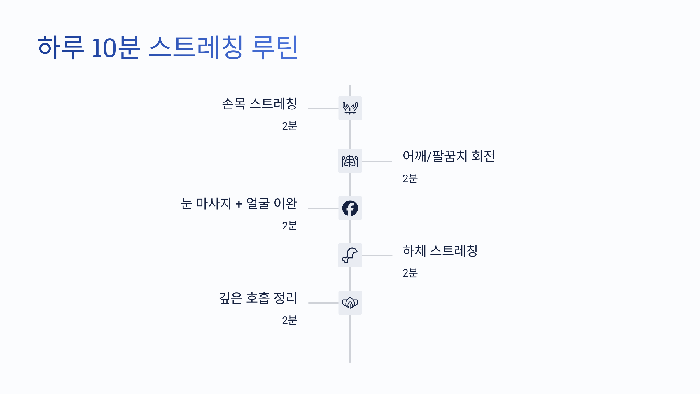 - 손등 스트레칭: 팔을 뻗고 손바닥을 아래로, 반대 손으로 손등을 부드럽게 눌러줍니다. 10초 유지