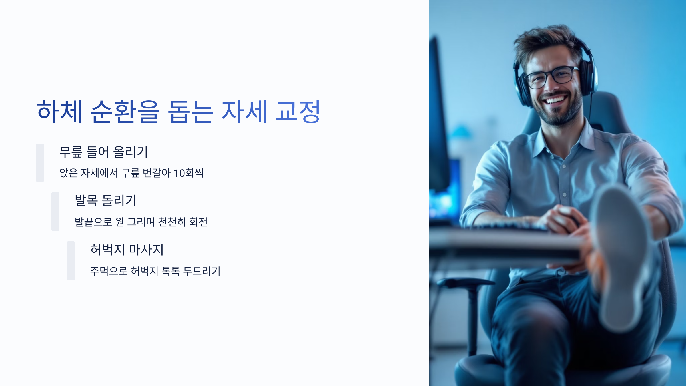 혈액순환이 원활해야 뇌의 집중력도 유지됩니다. 하체도 꼭 챙기세요!