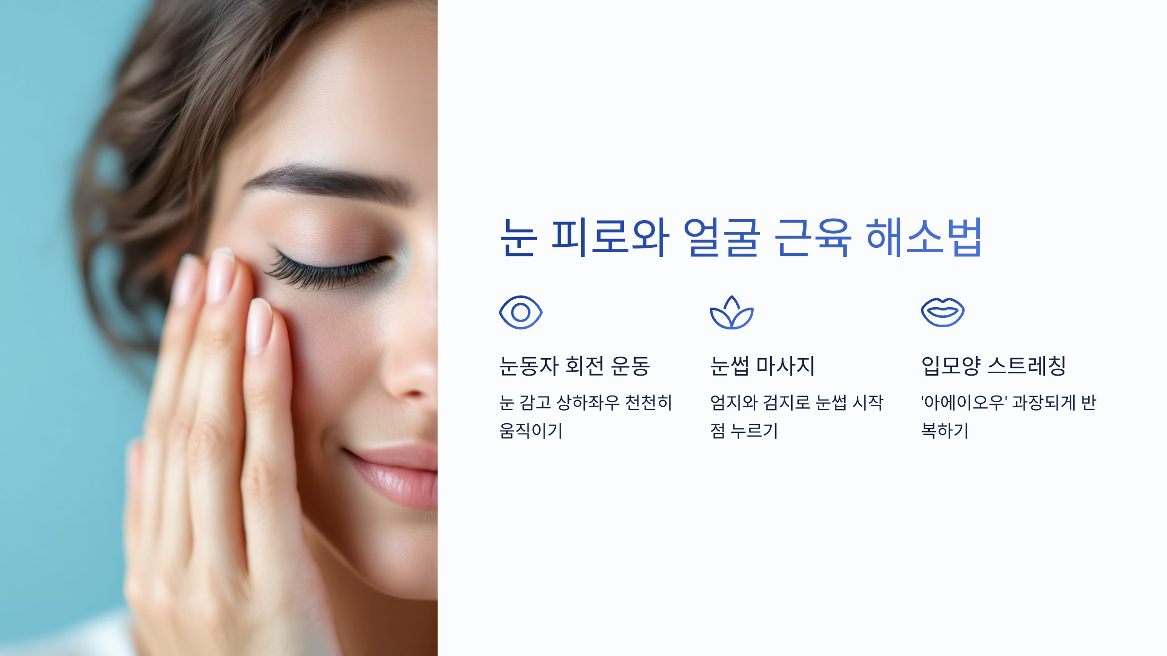 - 눈썹 마사지: 엄지와 검지로 눈썹 시작점을 지그시 눌러주기
